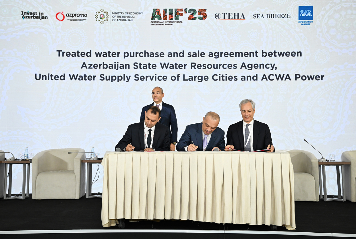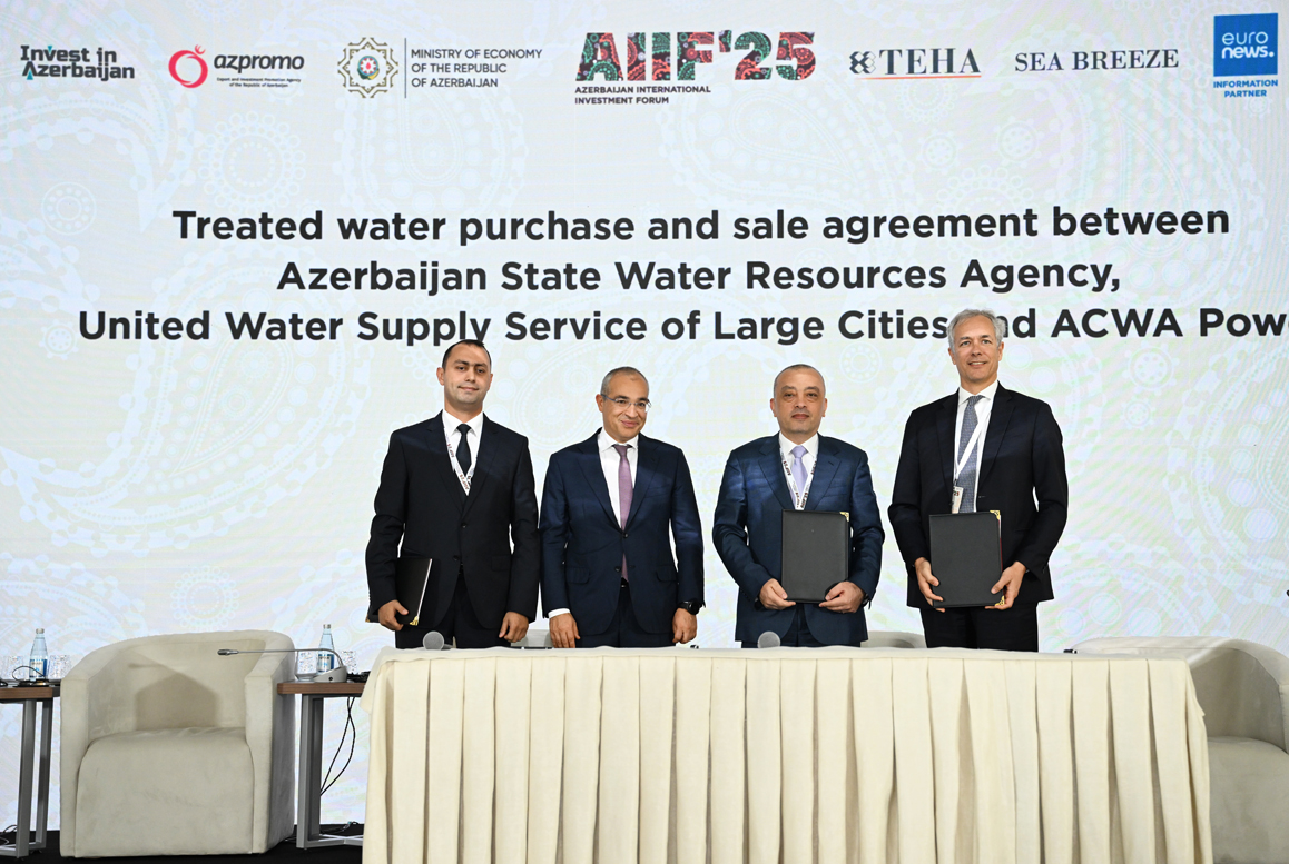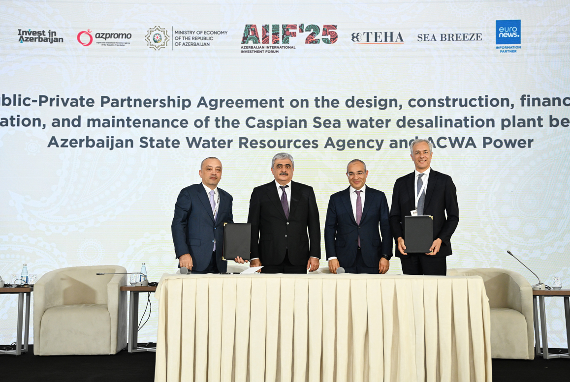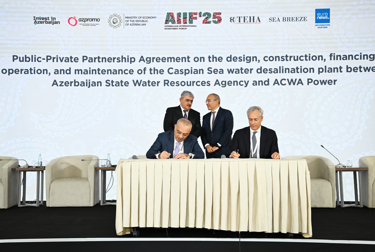 Xəzər dənizi suyunun duzsuzlaşdırılması zavodunun layihələndirilməsi, tikintisi, maliyyələşdirilməsi, istismarına dair Dövlət-Özəl Tərəfdaşlığı Müqaviləsi - sənədi Azərbaycan Dövlət Su Ehtiyatları Agentliyinin sədri Zaur Mikayılov və Səudiyyə Ərəbistanının “ACWA Power” şirkətinin baş icraçı direktoru Marco Arçelli imzalayıblar.