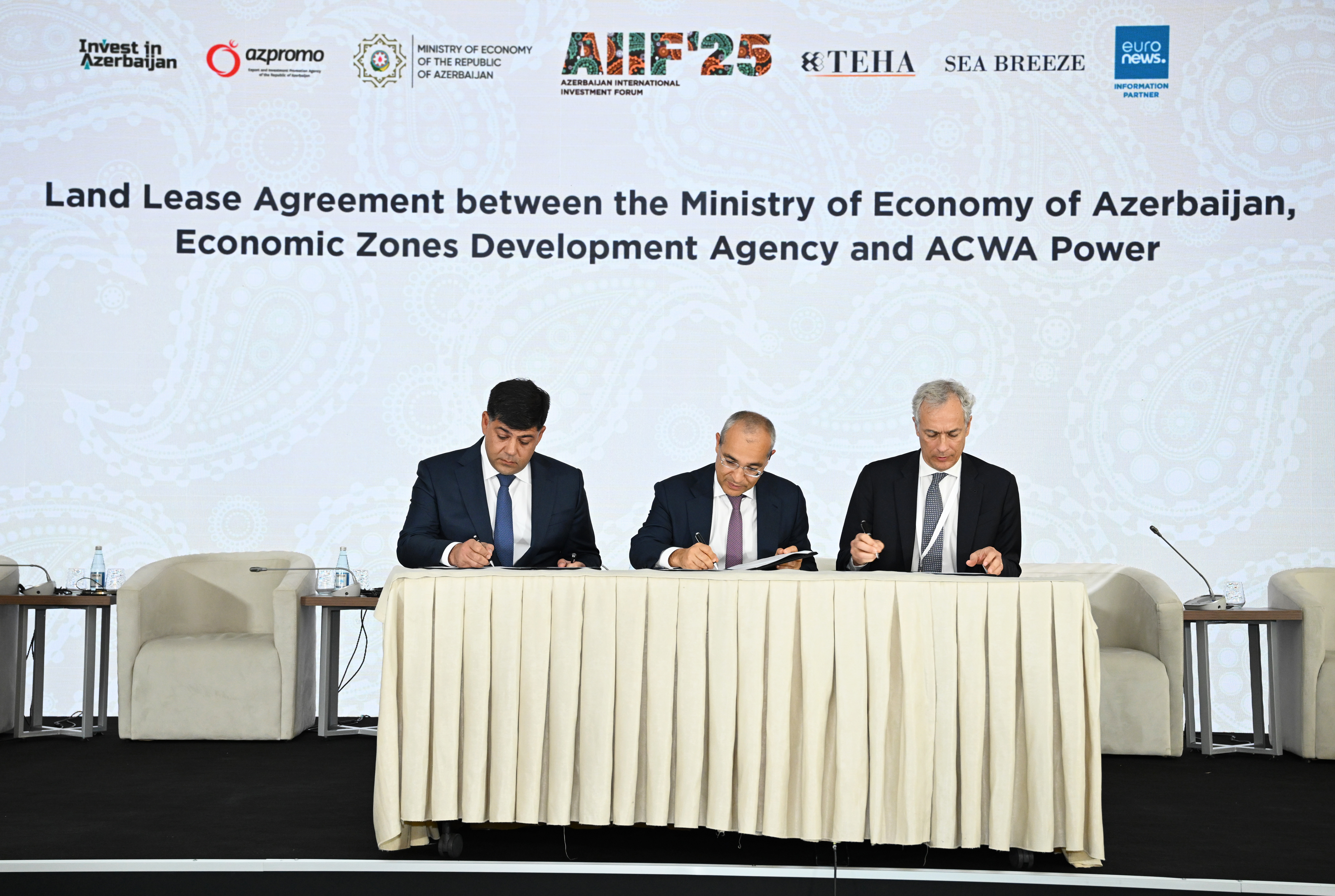 Daha sonra Azərbaycan Respublikasının Baş nazirinin müavini Samir Şərifov, iqtisadiyyat naziri Mikayıl Cabbarovun iştirakı ilə ölkəmizdə dəniz suyunun duzsuzlaşdırılması layihəsi ilə bağlı bir sıra sənədlərin imzalanma mərasimi keçirilib. Tədbir zamanı aşağıdakı sənədlər imzalanıb: