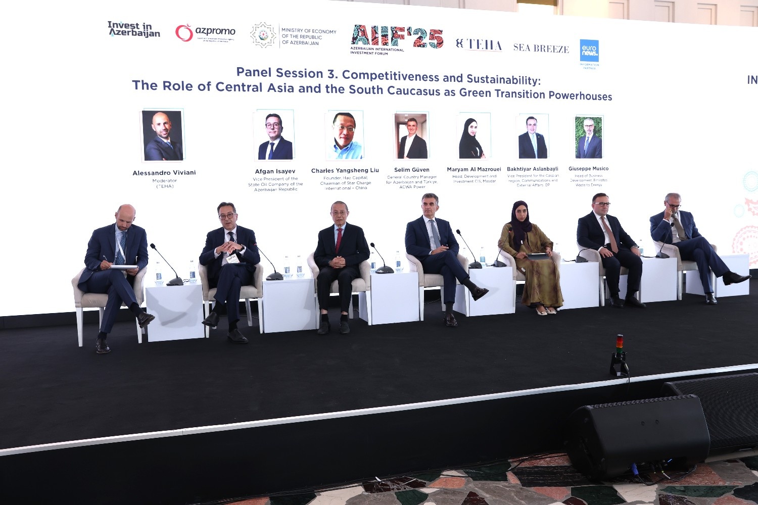 SOCAR-ın vitse-prezidenti Əfqan İsayev, Çinin “Hao Capital” şirkətinin təsisçisi, “Star Charge International” şirkətinin sədri Çarls Yanşenq Liu, “ACWA Power” şirkətinin ölkə rəhbəri Selim Güven, BƏƏ-nin “Masdar” şirkətinin MDB ölkələri üzrə İnkişaf və investisiya bölməsinin rəhbəri Maryam Al Mazrouei, “Emirates Waste to Energy” şirkətinin biznesin inkişafı üzrə rəhbəri Giuseppe Musico, bp şirkətinin Xəzər regionu üzrə vitse-prezidenti Bəxtiyar Aslanbəyli panel müzakirələrdə sualları cavablandırıb, mövzulara dair fikirlər səsləndiriblər.