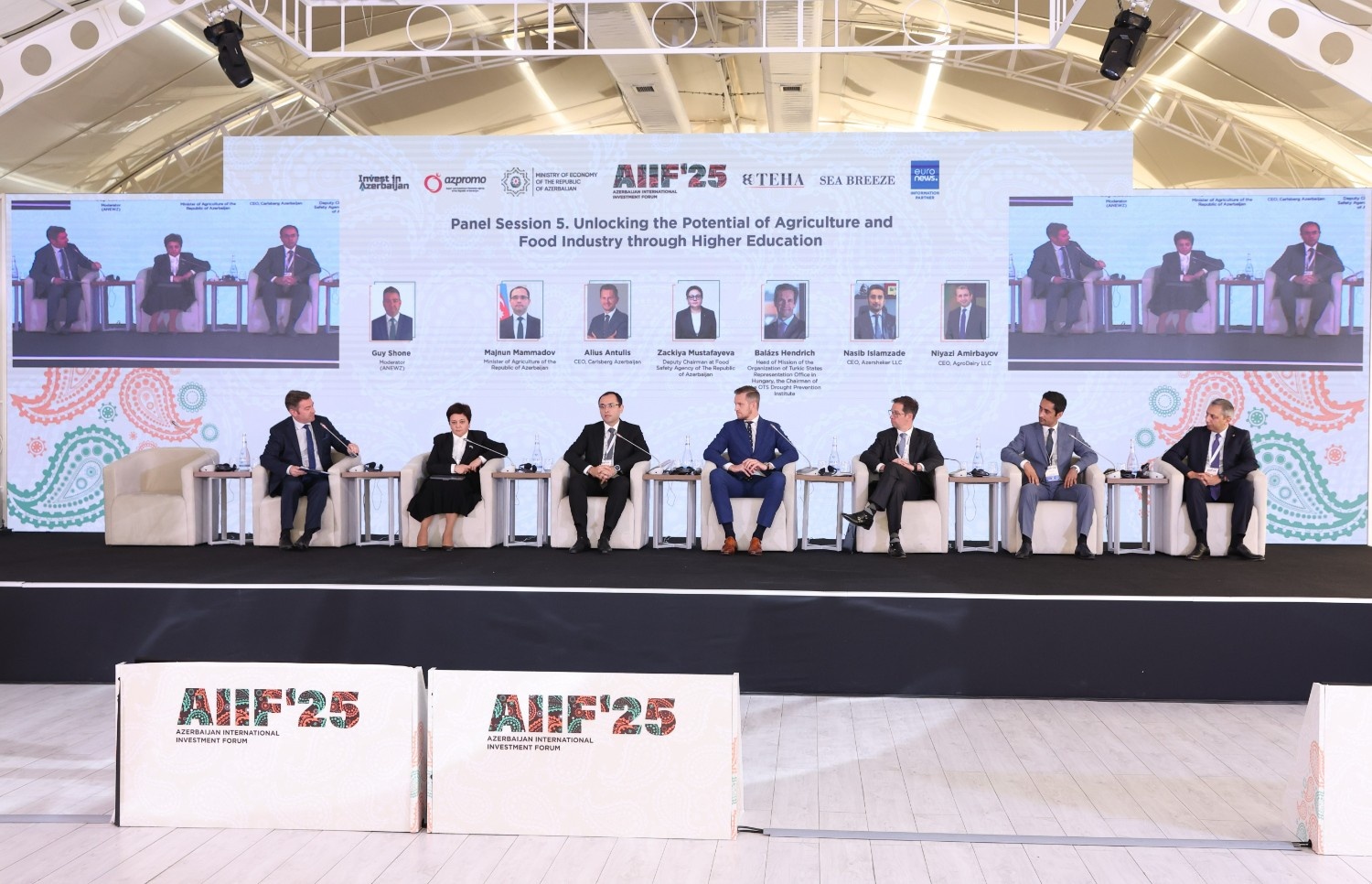 Daha sonra forum çərçivəsində “Ali təhsil vasitəsilə kənd təsərrüfatı və qida sənayesinin inkişaf potensialının artırılması” mövzusunda panel sessiya keçirilib. “ANEWS” televziyasının şef redaktoru Qay Şonun moderatorluğu ilə keçirilən panel sessiyada çıxış edən kənd təsərrüfatı naziri Məcnun Məmmədov Birinci Azərbaycan Beynəlxalq İnvestisiya Forumunun yerli biznes icmasına öz töhfəsini verəcəyinə inandığını bildirib. Qeyd olunub ki, ölkəmiz kənd təsərrüfatının inkişafı üçün uyğun iqlim və münbit torpağa malikdir. Azərbaycanın qida və tərəvəz ixracı son bir neçə ildə əhəmiyyətli dərəcədə artıb. Ölkəmizdə təsərrüfat sahiblərinə dövlət dəstəyi, xüsusilə, azad edilmiş ərazilərdə fermerlərə göstərilən dəstək mexanizmləri ilə bağlı məlumat verilib. Təhsil və tədqiqat kimi sahələrin kənd təsərrüfatının inkişafında mühüm rol oynadığı vurğulanıb.