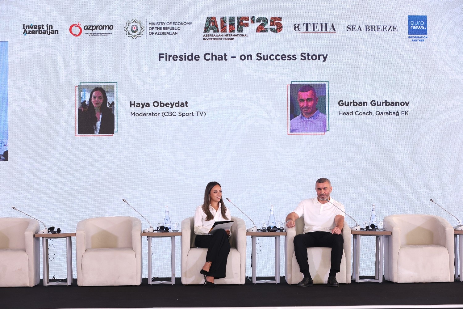 Birinci Azərbaycan Beynəlxalq İnvestisiya Forumunun ikinci günündə “CBC Sport” Televiziyasının əməkdaşı Haya Obeydatın moderatorluğu ilə “Uğur hekayəsi” mövzusunda “Qarabağ” futbol klubunun baş məşqçisi, əməkdar məşqçi Qurban Qurbanovla səmimi söhbət (fireside chat) keçirilib. Məşqçi öz həyat yolu, liderlik fəlsəfəsi ilə bağlı fikirlərini bölüşüb. Uğurun açarının daha çox çalışmaqda olduğunu bildirib. Futbolun bir biznes kimi inkişafı ilə bağlı sualları cavablandırıb.