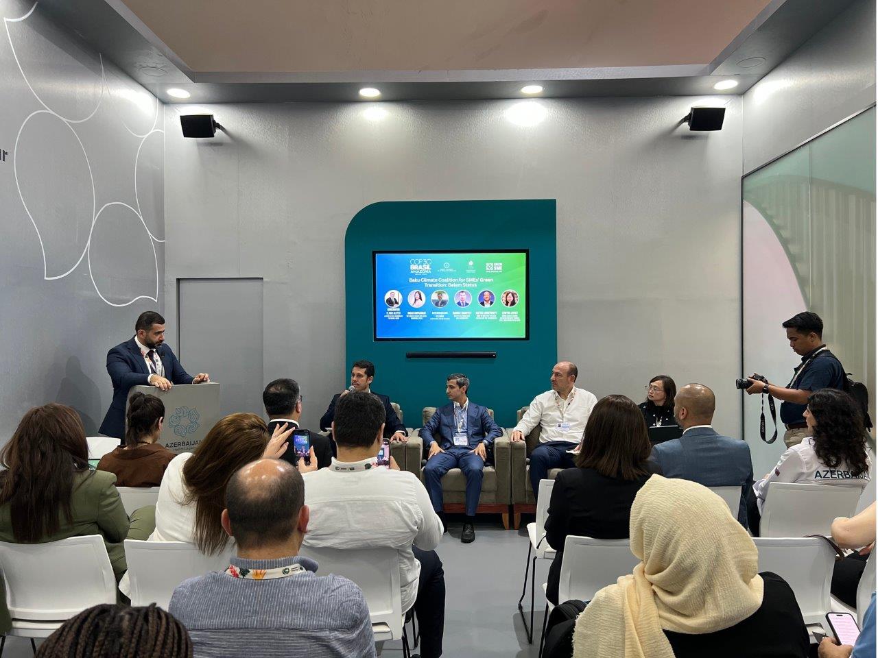 KOBİA-nın İdarə Heyəti sədrinin müşaviri Elnur Əliyevin moderatorluğu ilə keçirilən panel müzakirədə BMT-nin İqlim Dəyişikliyi üzrə Yüksək Səviyyəli Nümayəndəsi, COP29-un iqlim üzrə çempionu Nigar Arpadarai, SEBRAE-nın müşaviri Qustavo De Lima Cezario, “PAŞA Bank” ASC-nin icraçı direktorunun müavini Bəhruz Nağıyev, Beynəlxalq Ticarət Mərkəzinin Latın Amerikası və Karib hövzəsi üzrə ofisinin rəhbəri Matias Urrutigoity və Asiya İnkişaf Bankının İqlim Dəyişikliyi üzrə baş mütəxəssisi Esmyra Javier çıxış ediblər. Çıxışlarda KOB-ların yaşıl keçid prosesində üzləşdiyi çətinliklər, beynəlxalq təşkilatların mövcud dəstək mexanizmləri və təcrübələri barədə məlumat verilib. Həmçinin, “KOB-ların yaşıl keçidi üçün Bakı İqlim Koalisiyası üzrə Birgə Bəyannamə”nin mövcud statusuna dair məlumat diqqətə çatdırılıb, bəyannamənin təbliği istiqamətində görülmüş işlərin video icmalı təqdim edilib.