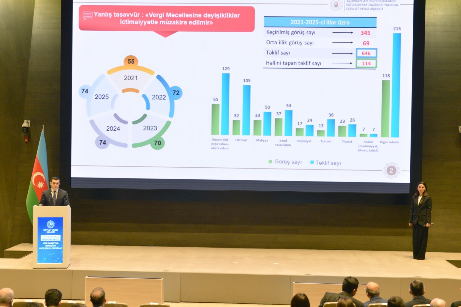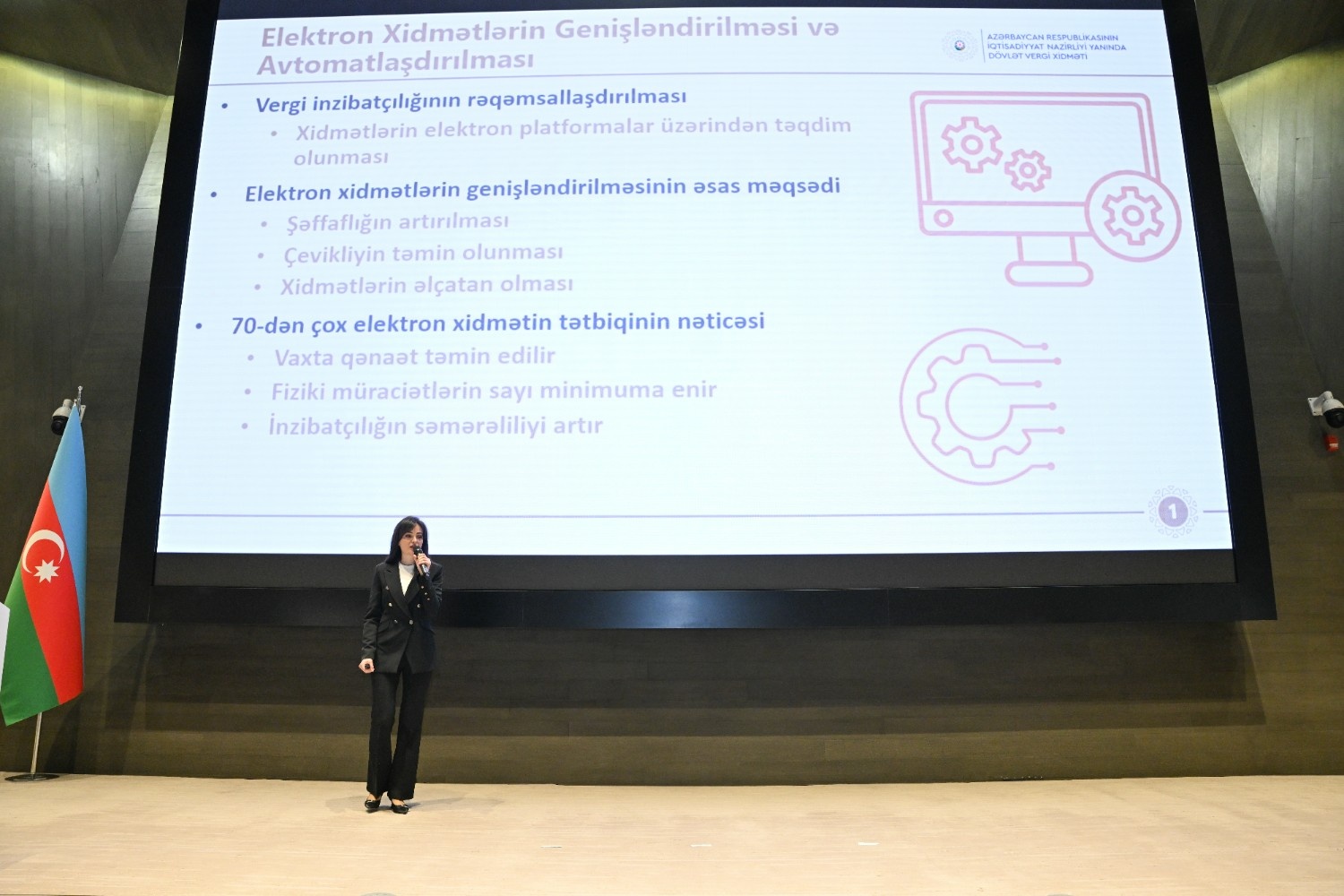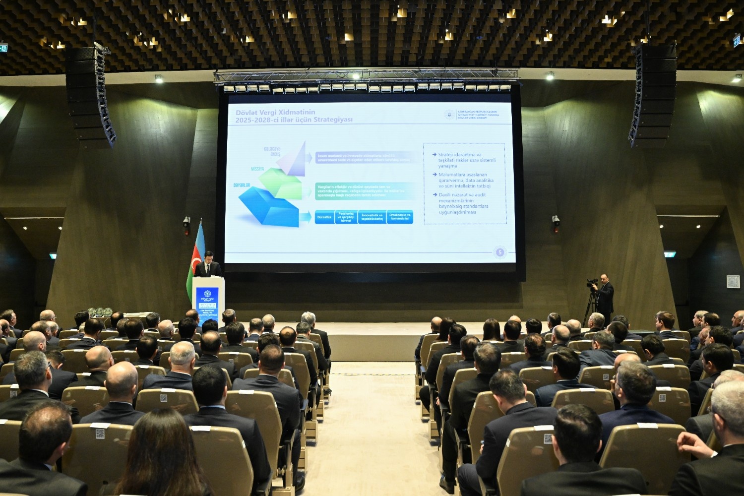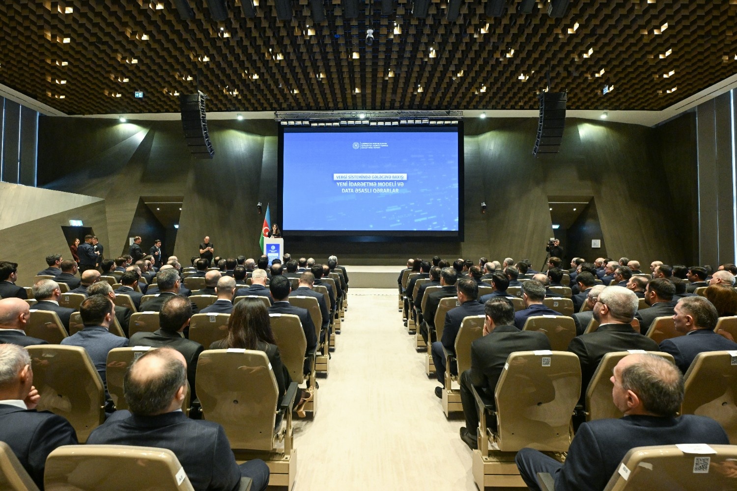 Tədbirdə Azərbaycan Respublikasının Baş nazirinin müavini Samir Şərifov çıxış edib. Baş nazirin müavini iqtisadi suverenliyin möhkəmləndirilməsi, dayanıqlı inkişafa təkan verən effektiv makroiqtisadi siyasət çərçivəsinin formalaşdırılması və vergi orqanlarının bu istiqamətdə artan rolu barədə məlumat verib. Qeyd edib ki, vergi sistemi dövlətin iqtisadi idarəetmə mexanizmlərinin əsas dayaqlarından biri olmaqla, makroiqtisadi sabitliyin qorunmasında, fiskal dayanıqlığın təmin edilməsində və iqtisadi proseslərin balanslı şəkildə tənzimlənməsində mühüm rol oynayır. Baş nazirin müavini biznes mühitinin yaxşılaşdırılmasına xidmət edən sistemli və ardıcıl yanaşmalar barədə də danışıb. Bildirib ki, bu prosesdə fiskal, vergi, sosial və maliyyə siyasətlərinin institusional koordinasiyası həlledici rol oynayır. Bu sinerji iqtisadi siyasətin effektivliyini, islahatların davamlılığını və əldə olunan nəticələrin uzunmüddətli olmasını təmin edir.